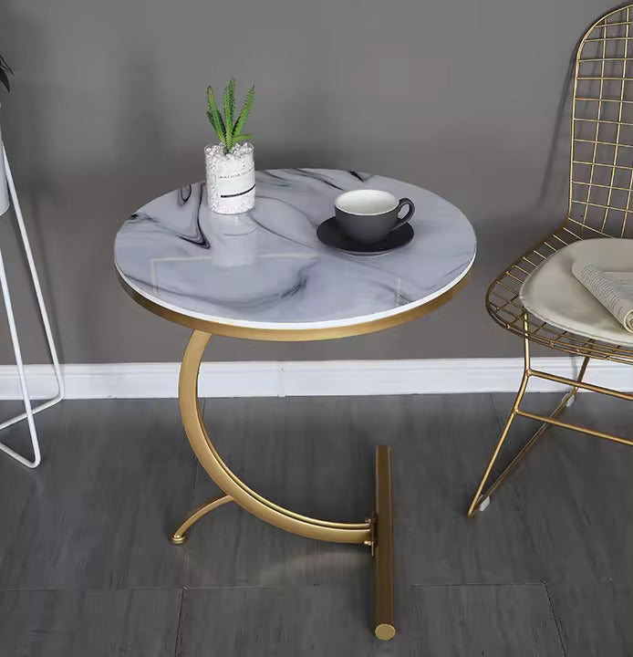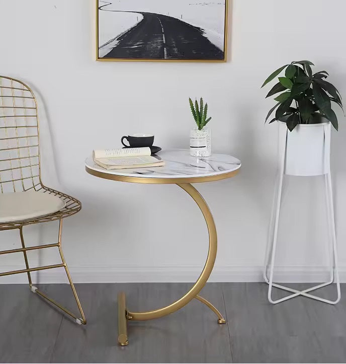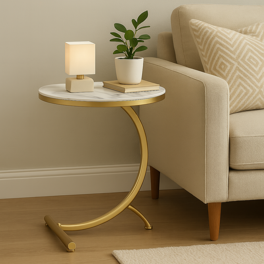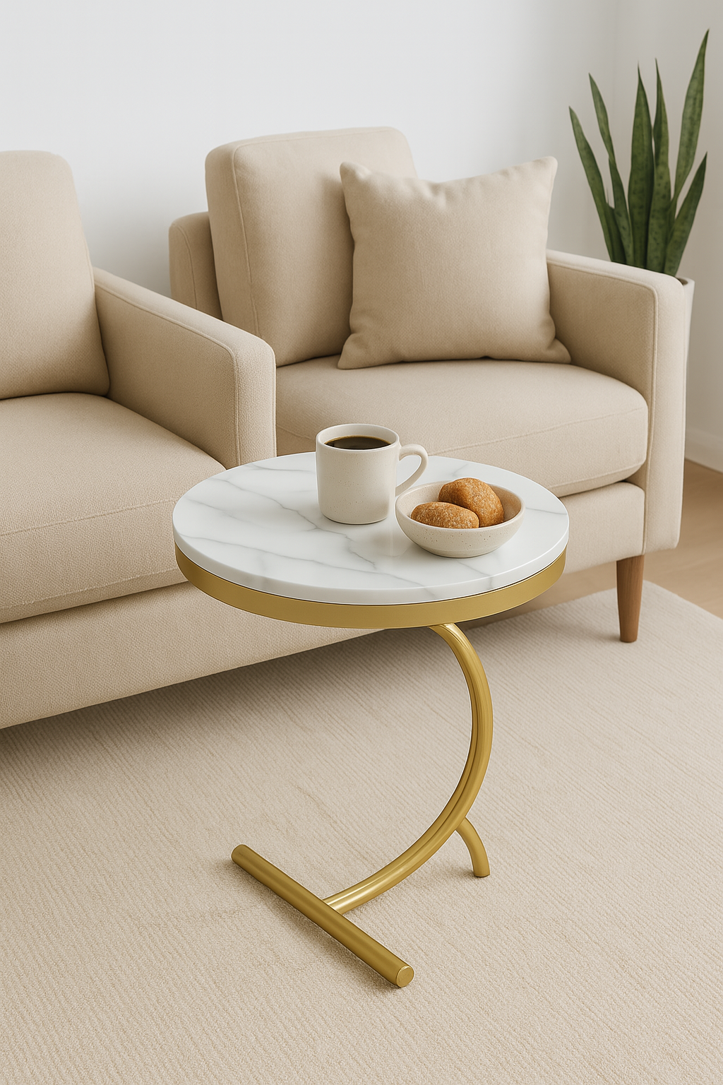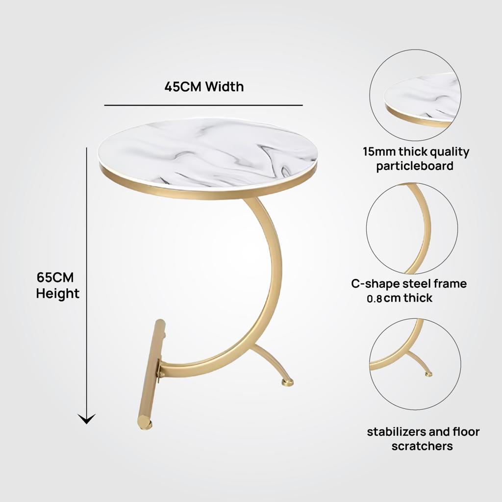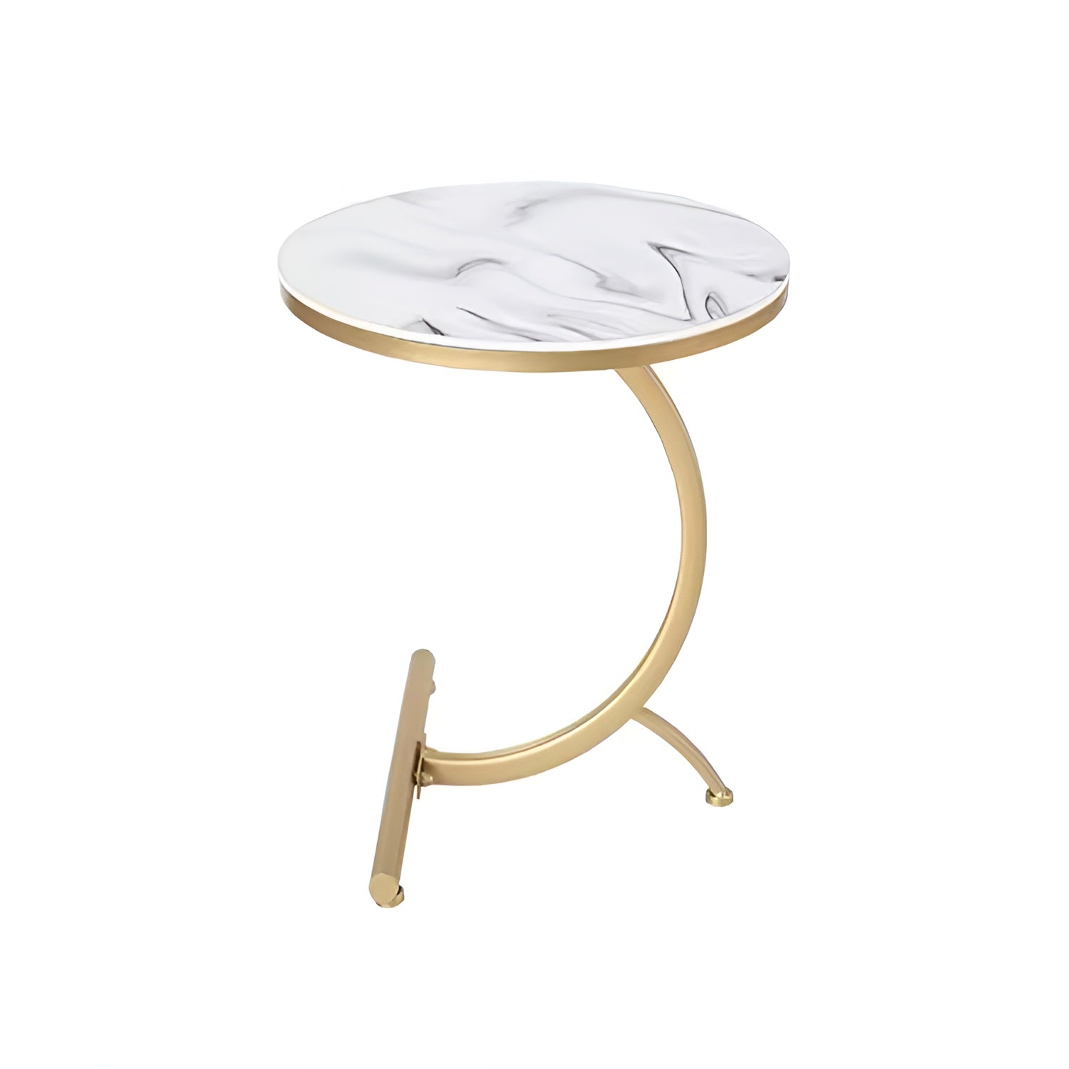 C-Shaped Round Side Table, Stylish Console, Corner Table - Wood Top, Metal Frame - 45cm Diameter x 65cm Hegiht, Gold and White