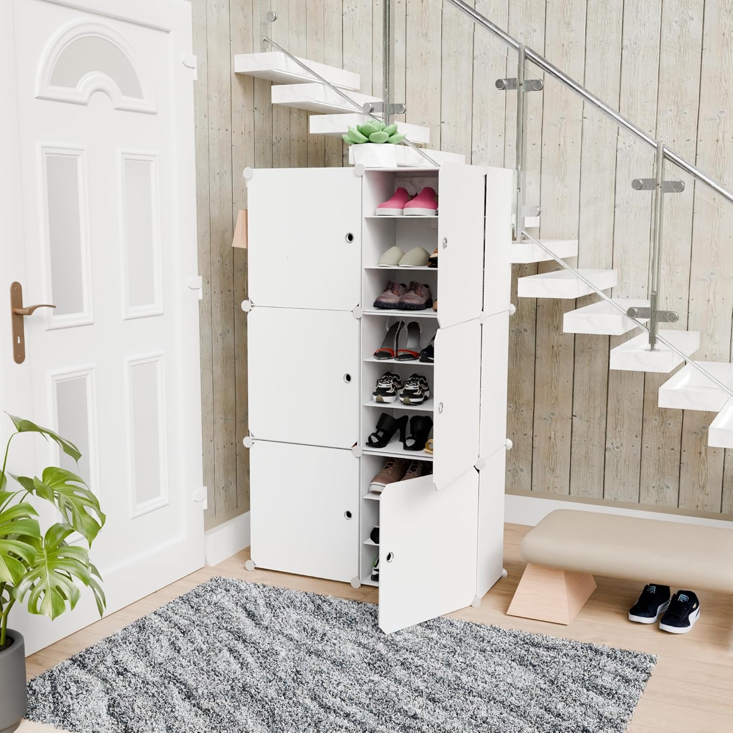 Lovstro Portable Shoes Cabinet for Closet and Entryway, Convertible with Doors, Shoe Rack, Strong Lightweight, Wardrobe Organizer Storage Box for Clothes (4 medium size cubes, White)
