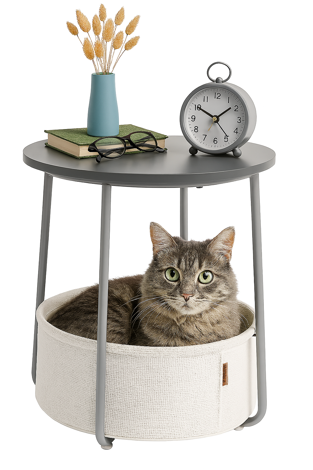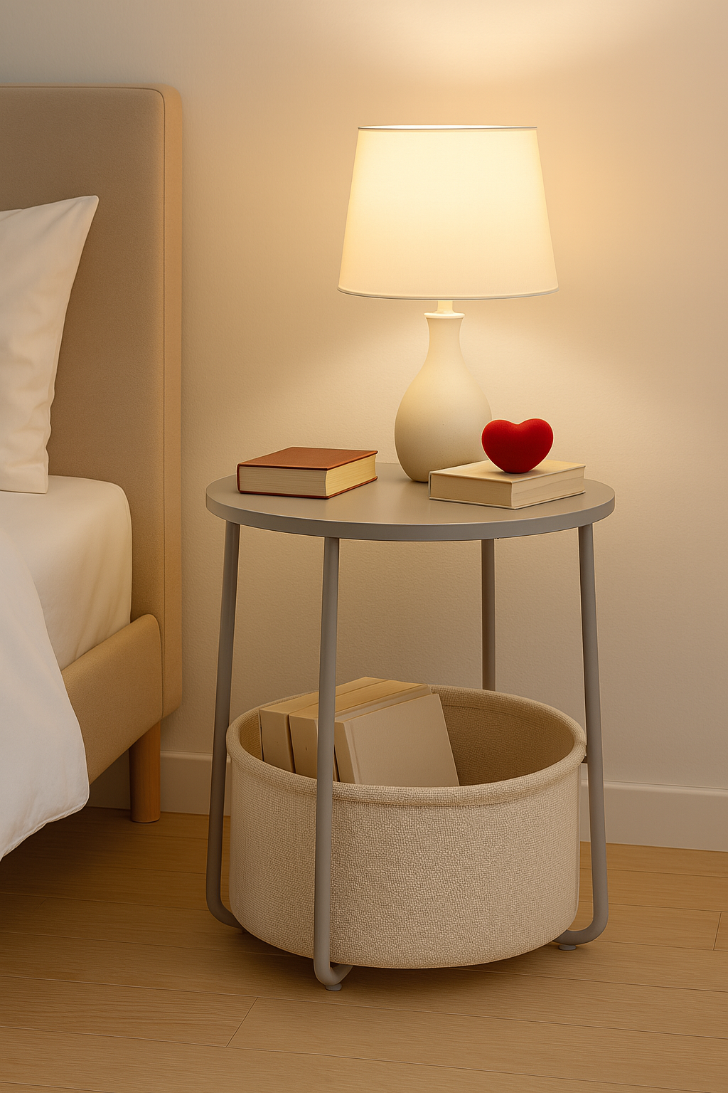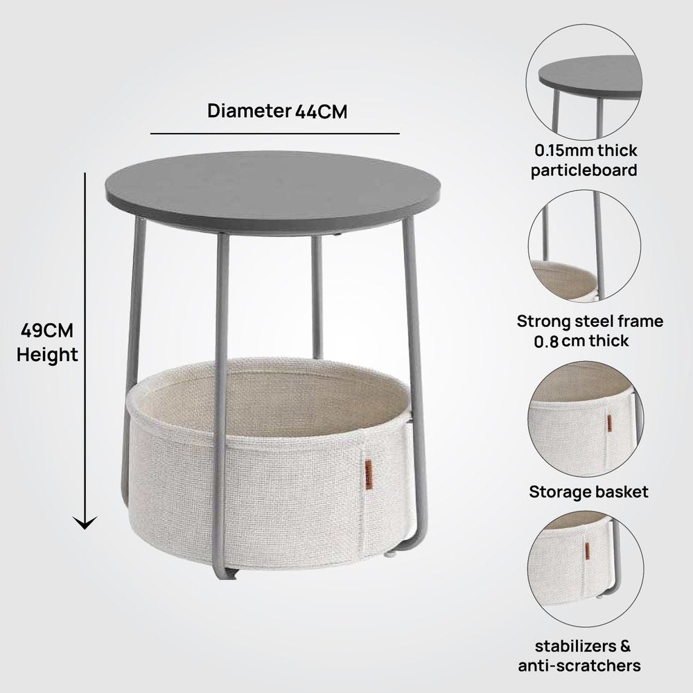 Round End Coffee Table with Storage Basket, Corner Table for Living Room, Bedroom Nightstand 44x49cm (Grey)